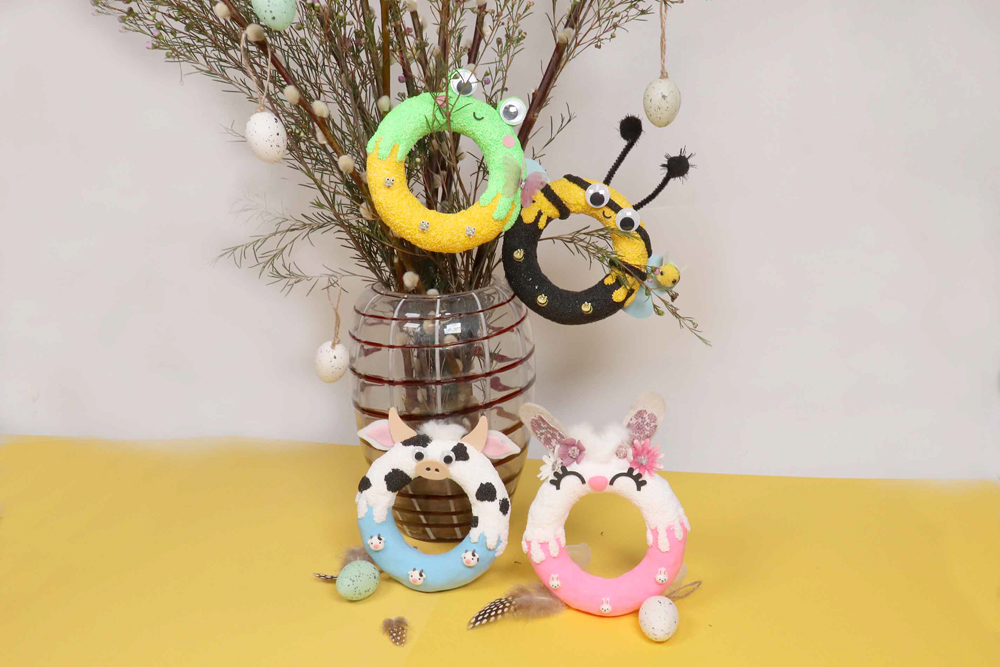 Maak 1 van de 4 donuts! De donuts worden gemaakt met foam klei. Kies uit een bij, konijn, kikker of koe. Ook leuk om op te hangen in de paas tak! LET OP! Deze editie hebben wij maar 1 workshop tafel dus VOL=VOL!